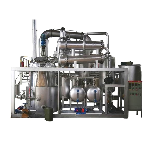 廢輪胎油煉油設(shè)備適用于輪胎裂解毛油、塑料裂解毛油的精餾提純,該工藝在高真空環(huán)境中對裂解后的輪胎油、塑料油進行減壓精餾產(chǎn)出高品質(zhì)燃料油,從而提高裂解油的市場用途。